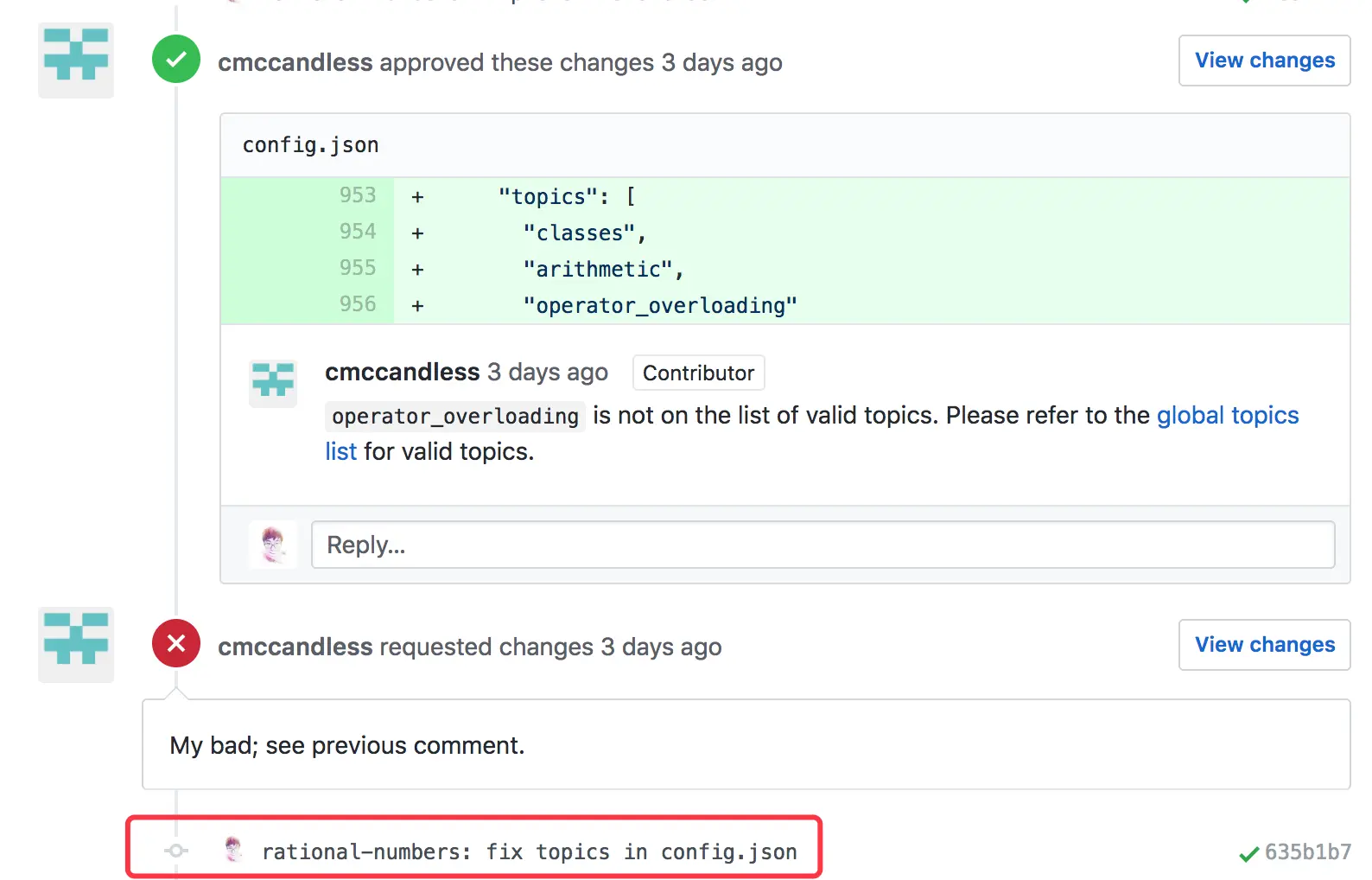 $ git commit -am "rational-numbers: fix topics in config.json"