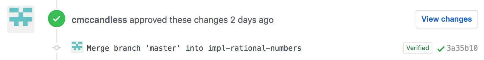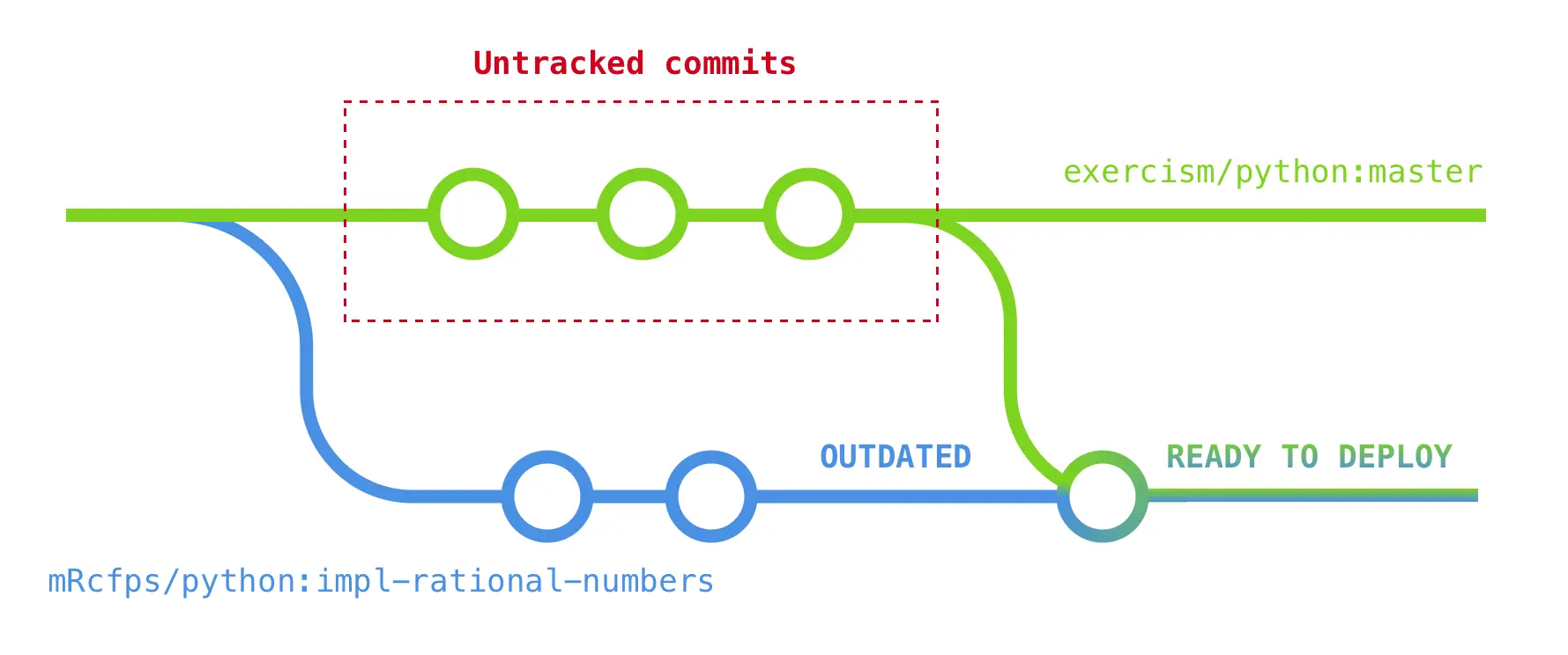 然后他将 exercism/python 的 master 分支并入了我们的 impl-rational-numbers 分支。他为什么要这么做呢?因为当我们在这个分支上工作时,exercism/python 的 master 分支上可能提交了新的修改,导致我们的分支并不是最新的。