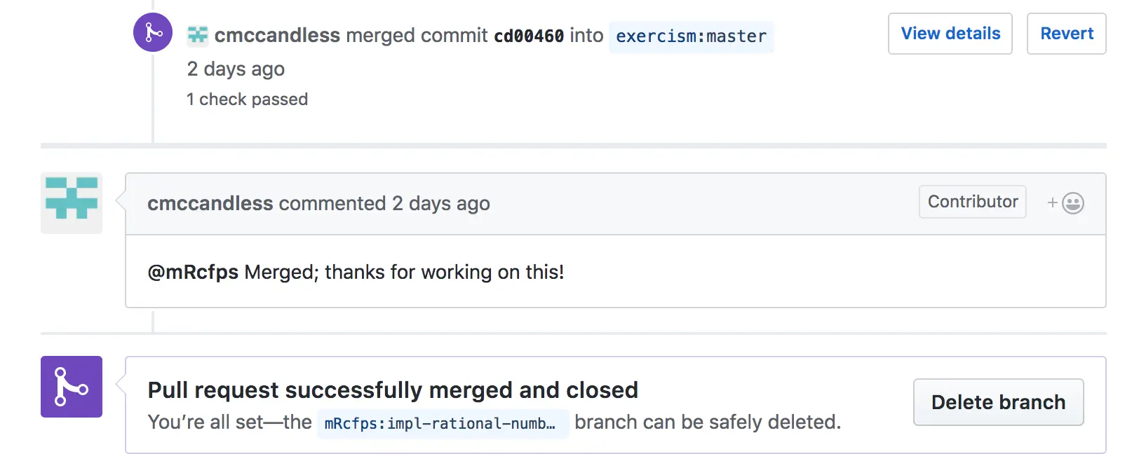 维护者紧接着就将我们的分支正式并入了 exercism/python 的 master 分支,这意味着我们的 PR 画上了圆满的句号,我们的贡献真正地进入到了原仓库!