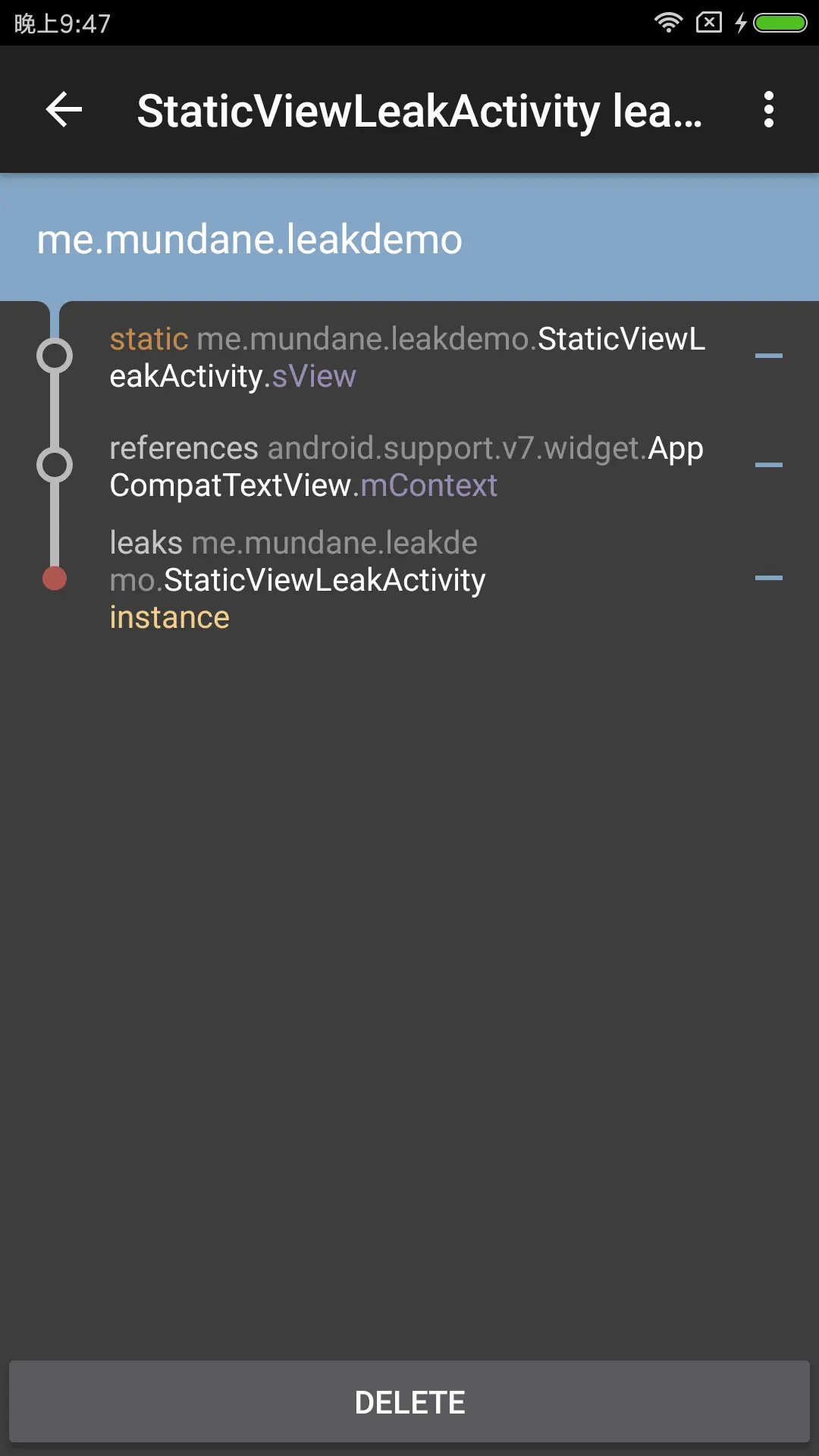 可以看到非静态内部类自动获得外部类的强引用,而且它的生命周期甚至比外部类更长,这便埋下了内存泄露的隐患。如果一个 Activity 的非静态内部类的生命周期比 Activity 更长,那么 Activity 的内存便无法被回收,也就是发生了内存泄露,而且还有可能发生难以预防的空指针问题。 举个例子: