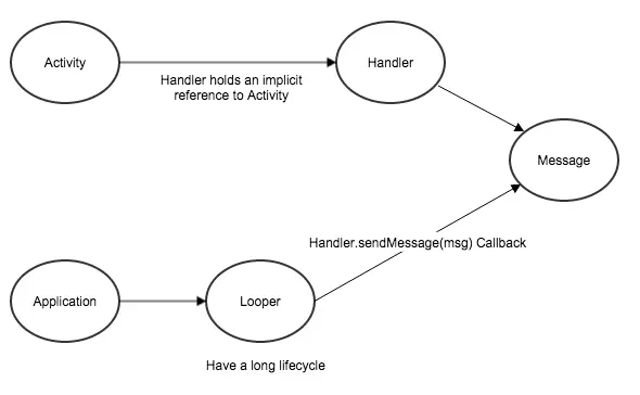 在 Java 中,非静态内部类包括匿名内部类,比如非静态的Handler会引用外部类对象this(比如 Activity) 而message又会引用handler, 看一下Handler的代码