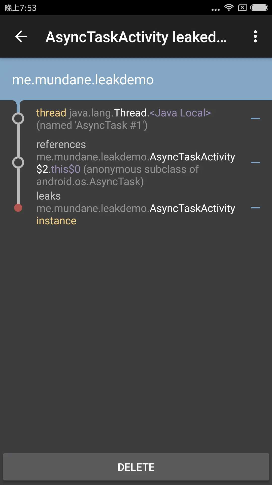 可以看到我们在 Activity 中继承 AsyncTask 自定义了一个非静态内部类,在 doInbackground() 方法中做了耗时的操作,然后在 onCreate() 中启动 MyAsyncTask。如果在耗时操作结束之前,Activity 被销毁了,这个线程在Activity销毁后还一直在后台执行,那这个线程会继续持有这个Activity的引用从而不会被GC回收,直到线程执行完成,这时候便会产生内存泄露。 解决方案1:使用非静态的内部类