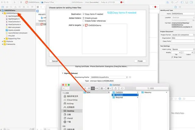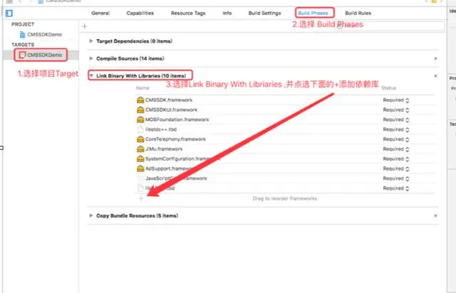 将整个名为’SDK’的文件夹拖入到Xcode项目中,如图操作所示