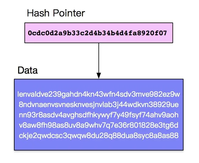 那么,从微观上理解区块链,就要从理解区块链最底层的数据结构开始。区块链(Blockchain),简单来说就是按时间顺序将数据区块通过哈希指针的方式连接起来的一个链表。哈希指针是区块链里最常用的数据结构,其实就是一串数据的哈希值,我们知道,一串数据的哈希值就是这串数据的指纹/摘要,因此就可以用这个哈希值来指向这串数据,如下图: