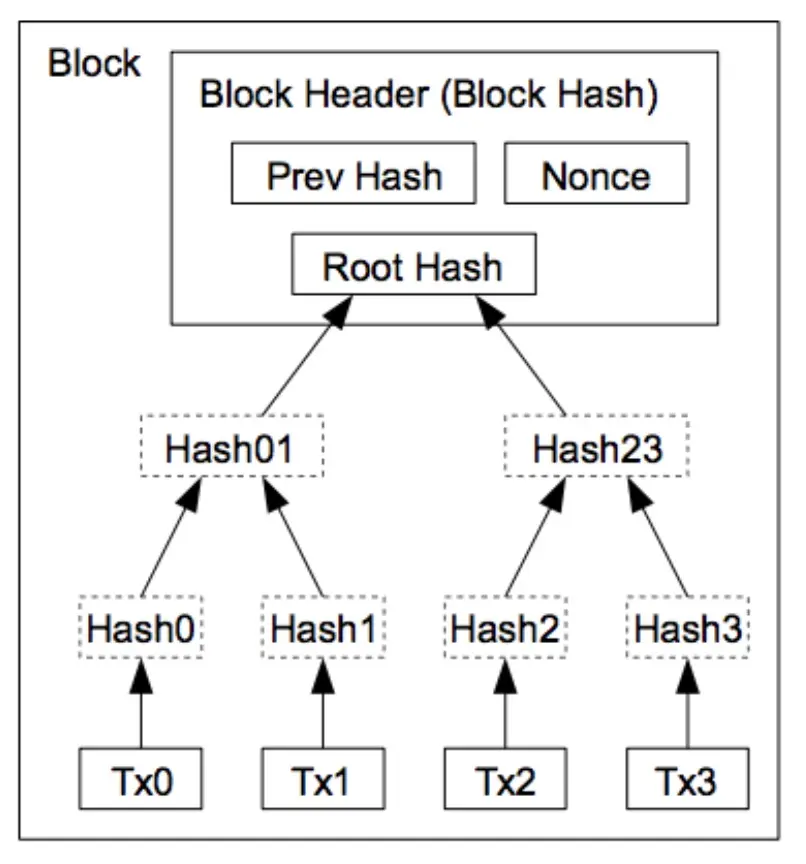 其中,Tx0 ~ Tx3 表示每一笔交易数据,Hash0 则是 Tx0 这笔交易数据的哈希指针,Hash01 则是 Hash0 + Hash1 的哈希指针,这样层层叠加上去,得到最后的 Root Hash。从图中也可以看出,从Hash0 到 Root Hash 是一个三层的二叉树,由于这颗树的所有节点都是 Hash 值,所以也称为 Hash Tree,但更专业的名称叫 Merkle Tree。不过 Merkle Tree 不一定是二叉树,也可以是多叉树。Merkle Tree 的叶子节点(即Hash0 ~ Hash3)是数据块的 Hash 值,而非叶子节点的 value 则是根据下面的叶子节点的 Hash 值串联起来后再计算 Hash 得出的。通过 Merkle Tree 结构,底层的每一笔交易也都无法篡改,一旦篡改,Root Hash 就会不一致。