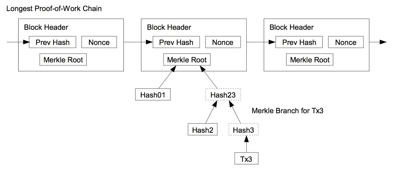 另外,该结构也简化了支付校验,比如,我们要校验 Tx3 这笔交易的有效性,那只要校验从 Tx3 到 Root Hash 的分支 Hash 值即可,如下图所示,计算 Tx3 的 Hash值得到 Hash3,再结合 Hash2,计算出 Hash23,再拼上 Hash01 计算出 Merkle Root,只要计算出来的 Merkle Root 和实际存储的 Root Hash 一致,则表明该该笔交易是有效的。