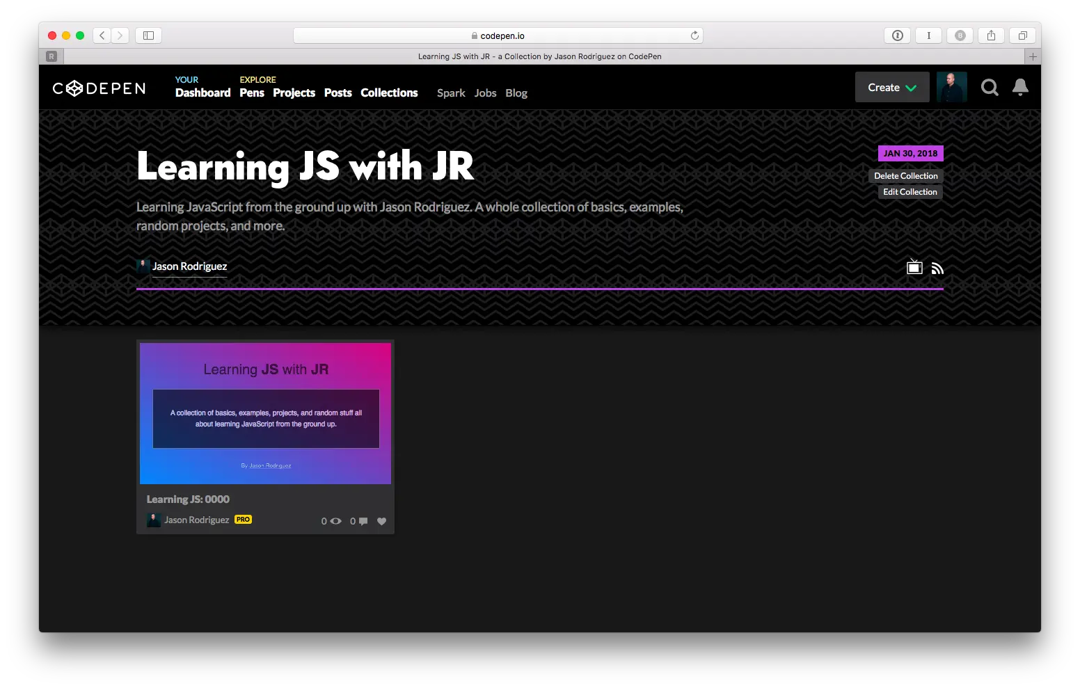 I’ve set up a new collection on CodePen to house my JavaScript projects throughout the learning process. I’ll keep that collection public so that anyone can see what I’m doing, fork examples, and school me on the best way to do things. If that sounds like your bag, then follow along on CodePen.