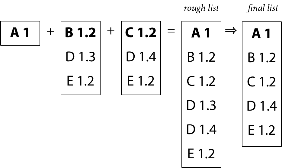 构建列表构造的递归定义如下. 通过启动一个空列表, 添加 M, 然后为 M 的每个需求附加构建列表, 构建 M 的粗略构建列表. 通过仅保留任何列出模块的最新版本, 简化粗略构建列表以生成最终构建列表.