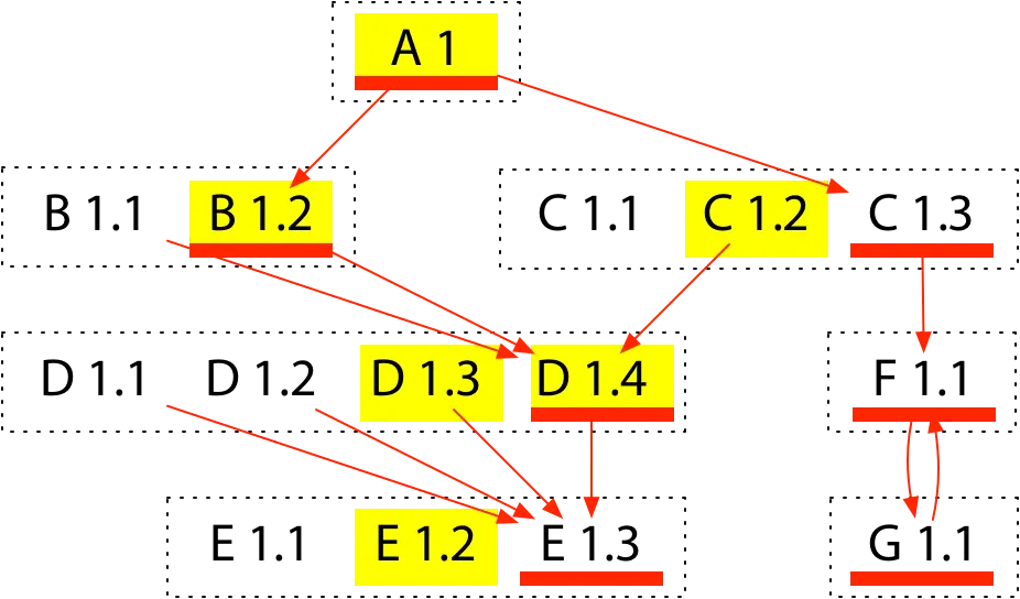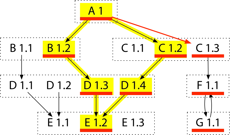 一个等效的, 更高效的构造基于图可达性. M 的粗略构建列表也仅仅是从 M 开始的后续箭头所需的所有模块的列表. 这可以通过对图的简单递归遍历来计算, 注意不要访问已经访问过的节点. 例如, A 的粗略构建列表是从 A 处开始并在高亮箭头后面找到的突出显示的模块版本.