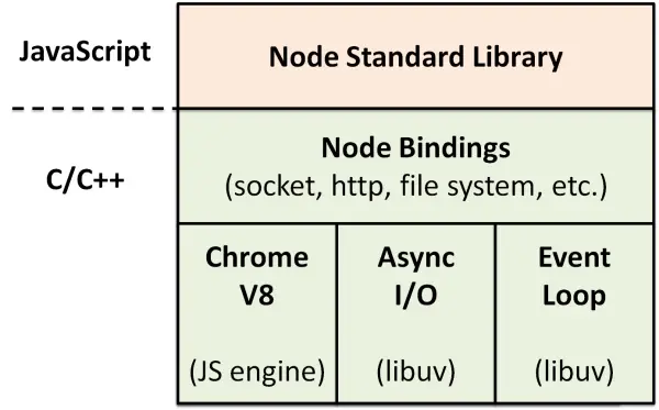 - 构建在 Chrome's V8 这个著名的 JavaScript 引擎之上,Chrome V8 引擎以 C/C++ 为主,相当于使用JavaScript 写法,转成 C/C++ 调用,大大的降低了学习成本
