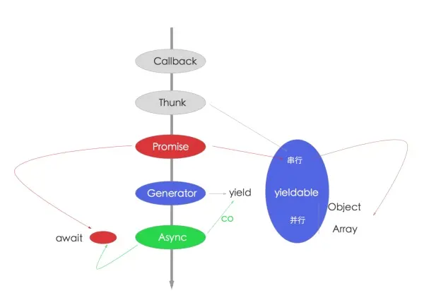 - 红色代表Promise,是使用最多的,无论async还是generator都可用