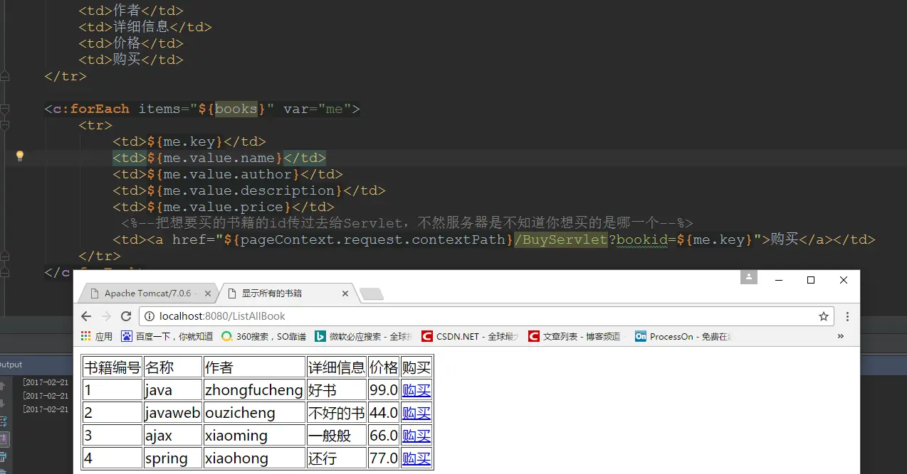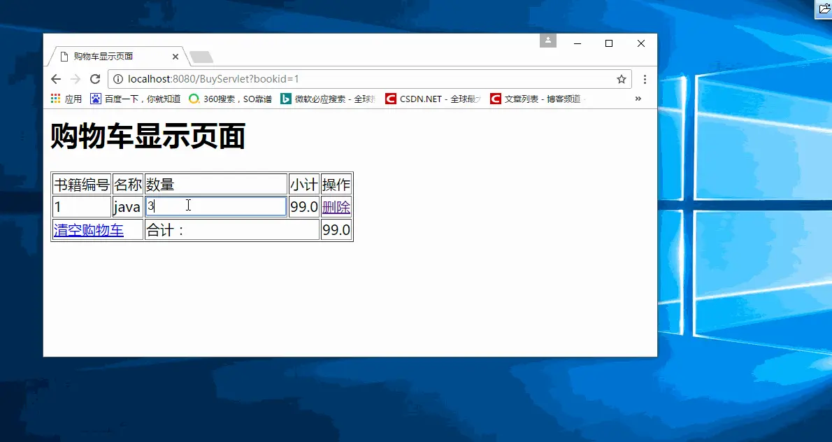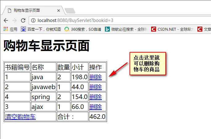 想要删除购物车中的商品,也很简单,把删除操作挂在超链接上,超链接指向DeleteCartServlet,并将想要删除的书本的id带过去(不将id带过去,服务器哪知道你要删除的是哪个)!