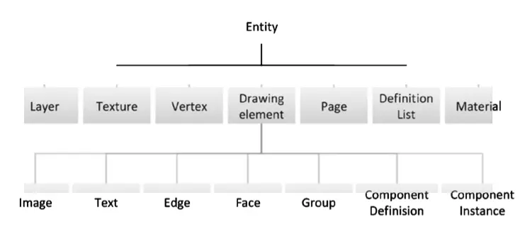 Entity 类也是一个超级类,提供了许多建立具体物件的方法,其中子类中的Drawingelement 为我们二次开发提供了大量对具体物件的操作API,画线画面等基本操作就是在这一层提供的,比如:add_line 、add_circle 返回一个Edge实体对象,add_face 返回face实体对象,这些对象都是Entity的子类Drawingelement的子类。
