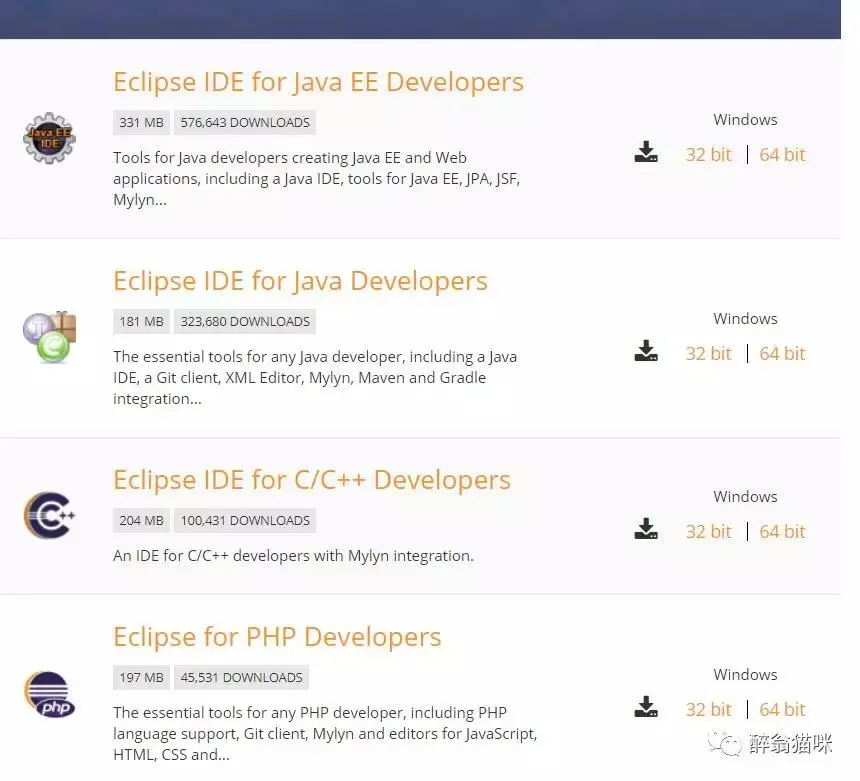 你可以看到的是,这么多,你点击Eclipse IDE for Java Developers ,然后自己选32或64旁边点击下载就好,下载的一个压缩包,解压后就可以用了。是不是很简单啊。有人遇到eclipse不兼容JDK 9.0的情况,解决方案就是打开eclipse.ini文件,在文件末尾添加一行:--add-modules=ALL-SYSTEM
