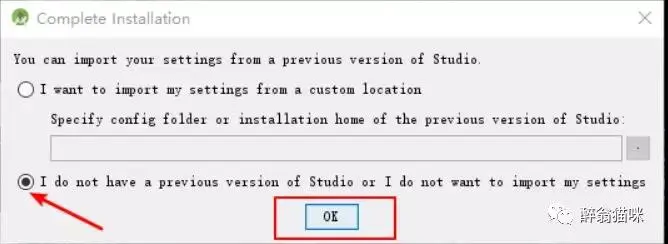 第二个表示没有下载过Android studio,第一个表示下载过,如果选择第一个表示导入你之前的配置,更新还是选择第二好,因为版本毕竟不一样。然后进入到多数人不懂的界面。