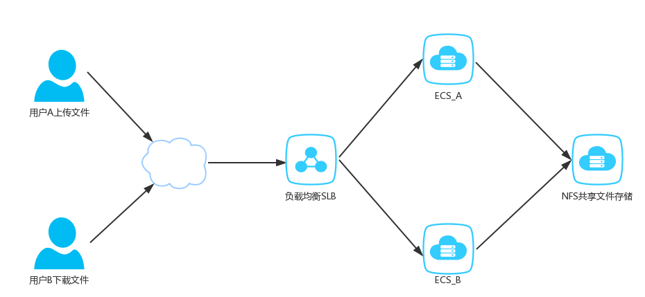 当用户A通过互联网上传文件时,经过负载均衡,无论发送到哪个节点都会被存储到NFS文件服务器。但是当用户B去下载这个文件的时候,任何节点都可以读取NFS文件服务器的文件。