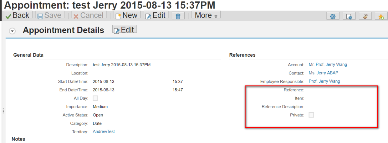 以一个具体的例子来说明。在Appointment的Overview page上能看见一个名叫Reference的区域,这里可以维护一些其他的业务文档的ID,这样可以将该业务文档同当前正在编辑的Appointment关联起来。