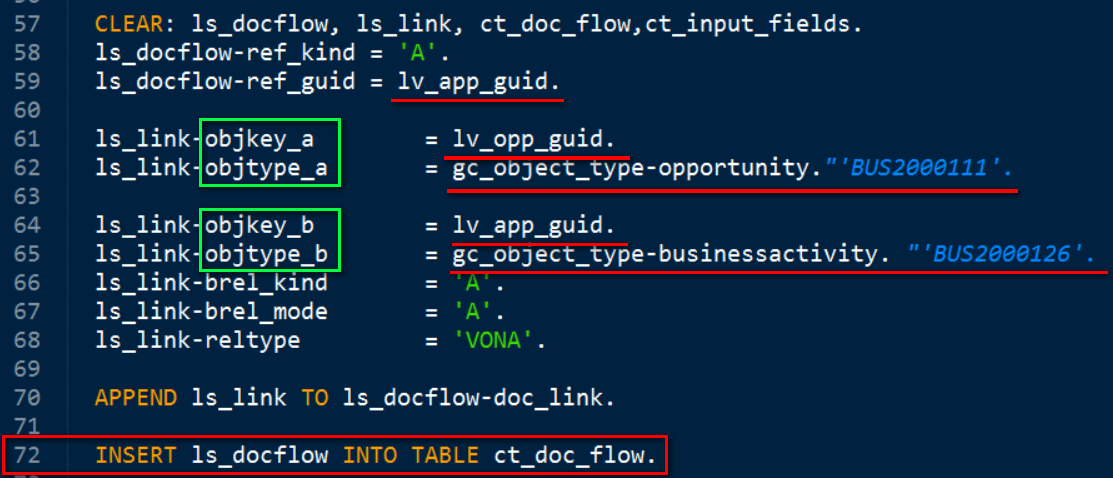 这个ct_doc_flow的内容生成逻辑如下。既然是Document Flow,必然涉及到两个document,在API里用后缀为A和B的字段来存储,如下图绿色区域所示。这些字段需要分别存储两个document的GUID和BOR类型。