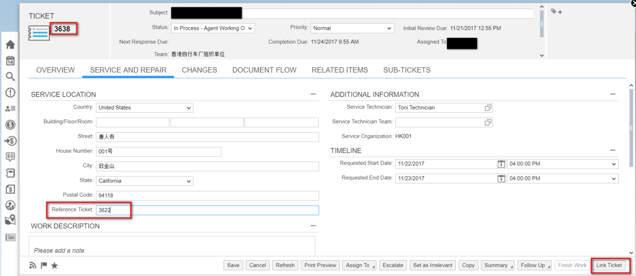 2. 假设我想把Ticket 3638和Ticket 3622关联起来,我需要打开Ticket 3638,在新字段Reference Ticket里手动输入3622,然后点击按钮Link Ticket.