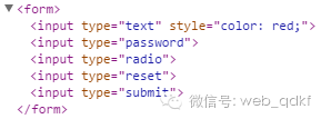 <form> <input type="text" /> <input type="password" /> <input type="radio" /> <input type="reset" /> <input type="submit" /></form><script type="text/javascript"> $(function(){ $(":text").css("color","red"); });</script>