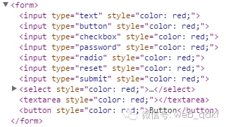 <form> <input type="text" /> <input type="button" /> <input type="checkbox" /> <input type="password" /> <input type="radio" /> <input type="reset" /> <input type="submit" /> <select><option>Option</option></select> <textarea></textarea> <button>Button</button></form><script type="text/javascript"> $(function(){ $(":input").css("color","red"); });</script>