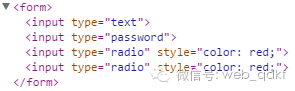 <form> <input type="text" /> <input type="password" /> <input type="radio" /> <input type="radio" /></form><script type="text/javascript"> $(function(){ $(":radio").css("color","red"); });</script>