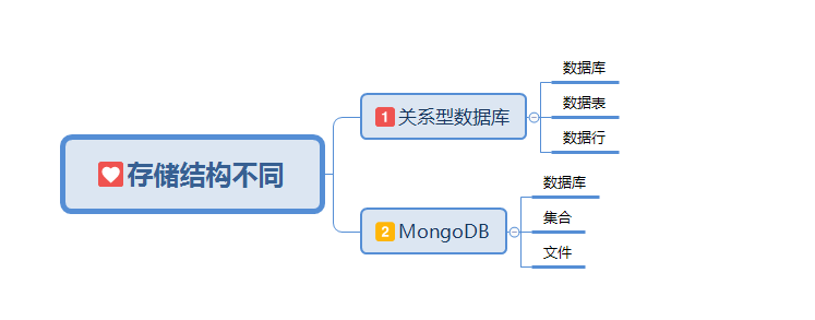 以前我们的关系型数据库的数据结构都是顶层是库,库下面是表,表下面是数据。但是MongoDB有所不同,库下面是集合,集合下面是文件,可以看下面这张图进行了解一下。