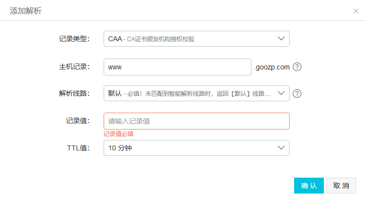添加 DNS 解析,选择 CAA 类型,填写通配符还是非通配符的,然后就是记录值了。如下图: