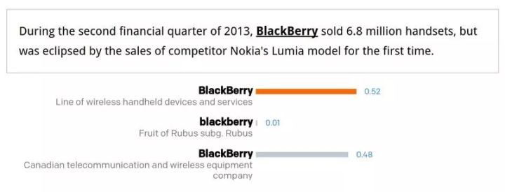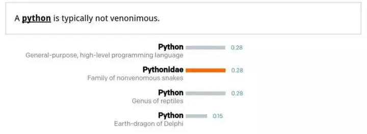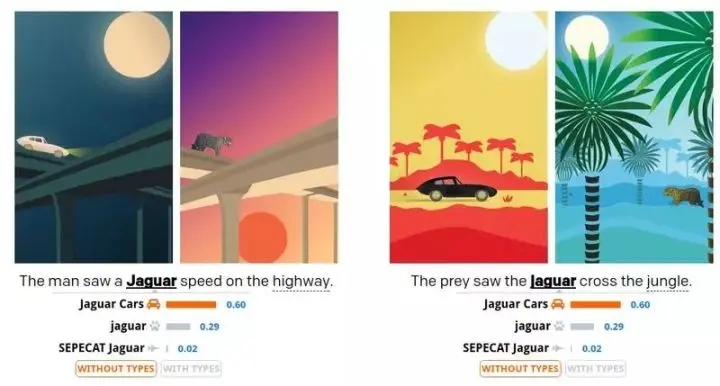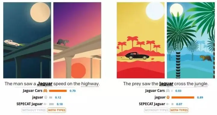 上图是对该类型系统的一个简单说明。在训练数据中 jaguar 被认为是捷豹汽车的概率是 70%,被认为是美洲豹的概率是 29%,被认为是豹式飞机的概率是 1%。使用我们的“类型”方法进行判断,对第一个例子中的消岐效果影响不大,因为模型认为美洲豹沿着高速公路奔跑的情况是可能存在的,但是在第二个例子中,模型认为捷豹汽车穿越丛林这件事显然是不太可能出现的。