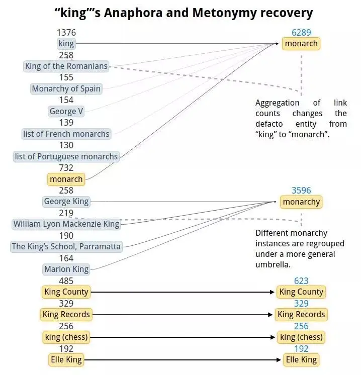 对于一些实体,维基百科内部链接的统计可以提供一个比较好的相关短语。然而,有些时候链接到的是具体的实例而不是类别本身,这样就会产生信息上的噪声 (anaphora-- 例如,国王 (king) 这个词就会被链接到英格兰查理一世 (Charles I of England))。这种情况会导致相关实例的数量的爆炸增长与链接有效性的下降 (例如,queen 被链接到了乐队 Queen(皇后乐队)4920 次,Elizabeth II(伊丽莎白二世)1430 次,monarch(君主) 只有 32 次)。