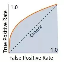 ROC 曲线绘制了真阳性率 (true positive) 随假阳性率 (false positive) 增加时的变化情况,上图是一个 AUC 为 0.76 时的 ROC 曲线。一个随机的分类器将会得到一条直线作为其 ROC 曲线 (图中的虚线)。