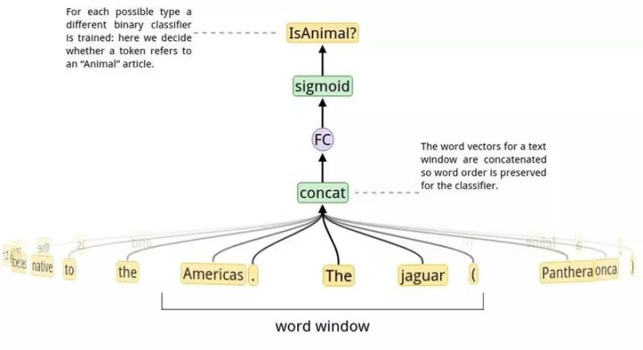 - 使用每个维基百科的内部链接以及其上下文来产生训练数据,我们需要使用神经网络来学习一种映射关系,即单词到 100 维的二值向量之间的映射。这一步将之前的步骤联系起来:维基百科的链接将单词与实体相连,通过第二步我们知道了每一个实体的类别,而第三步则在我们的类型系统中选择了实体所属的类别。