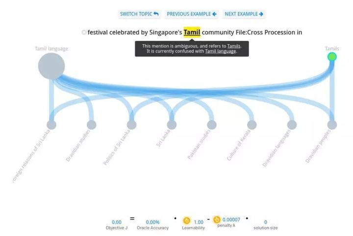 为了更好的了解在设计一个类型系统时,哪些部分比较容易哪些部分比较困难,原文提供了一个交互式的系统让用户可以手动训练自己的类型系统,通过选择你认为正确的连接关系,可以达到消歧的目的。在这个系统中,你可以选择一个大类,比如下图中的 Politics&Business, 然后对其中有歧义的词语开始进行训练。