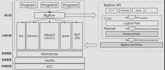 它的设计中有许多思想借鉴自Google Flume Java以及Google Cloud Dataflow,另有部分接口设计借鉴自Apache Spark。用户基本可以不去关心Bigflow的计算真正运行在哪里,可以像写一个单机的程序一样写出自己的逻辑,Bigflow会将这些计算分发到相应的执行引擎之上执行。