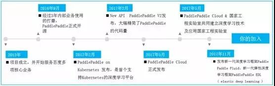 PadddlePaddle最早自2013年就开始投入百度多项业务的应用,在百度内部发展3年左右的时间,于2016年9月正式开源,然后PaddlePaddle经历了一个高速迭代优化的过程,最新版本是于2017年11月发布的PaddlePaddle Fluid,这个版本的发布,赋予了PaddlePaddle更为强大的功能和优势。