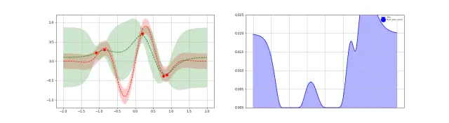 实际中,为了使式 (10) 最大,通常利用梯度的解析表达式和梯度下降法,这是 SKLearn 采取的方法。模型的一个优点是能够优化 GP 的超参数。然而,式(10)不一定是凸的,通常存在多个局部最小值。为了获得一个好的最小值,可以尝试在一些优秀的初始点上进行初始化。或者可以在随机点重复初始化梯度下降,最后选择最优解。