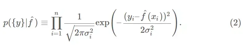 我们要做的第一个假设是,假如实际函数是 f hat,那么我们的测量值 y 关于 f hat 是独立的并且服从高斯分布。这个假设意味着方程 (1) 右边的第一项是: