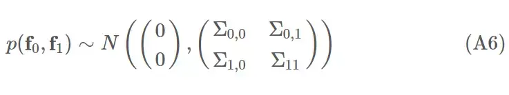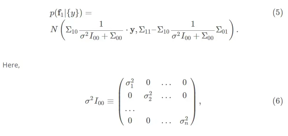 现在,如果我们把式 (2) 和式 (3) 代入式 (1),将得到后验概率 p(f1|{y}) 的表达式。这是一个指数函数,它的独立变量是 f_i 函数中的二次项。也可以说,与前验概率一样,后验概率服从多变量正态分布。通过简单计算,就可以得到这个分布均值和协方差的明确表达式:使用块(符号),其中 0 对应于采样点,1 对应于测试点,测试点的边缘分布是