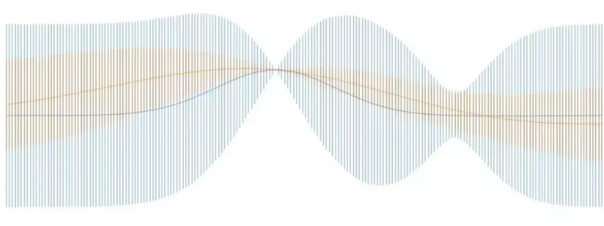 means, stds = model.interval(test_x)在以上代码块中,WIDTH_SCALE 和 LENGTH_SCALE 用来指定协方差矩阵式(4)。前者对应于等式中的σ,后者对应于 l。增加 WIDTH_SCALE 对应于未知函数大小不确定度的增加,增加 LENGTH_SCALE 对应于增加我们期望的函数平滑程度。下图说明这些问题:这里,通过设置 WIDTH_SCALE = LENGTH_SCALE = 1 获得蓝色区间,通过设置 WIDTH_SCALE = 0.5 和 LENGTH_SCALE = 2 获得橙色区间。结果是橙色相对蓝色后验估计更加紧密平滑。在这两幅图中,实曲线表示后验分布均值,竖线表示一个σ置信区间。