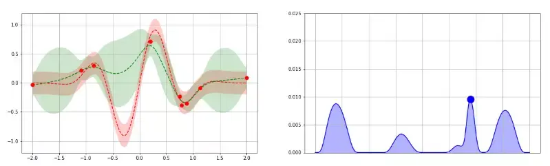 本文最开始处的动图展示了一个实际的 GP 搜索,使用 skopt[5] 在 python 中执行。左边的红色曲线是正在寻找全局最小值的(隐藏)曲线 f。红点是目前已经获得的样本,绿色阴影曲线是每个点的 GP 后验置信区间,该置信区间会随着更多样本的获得而逐渐改进。右边是通过在 GP 后验基础上分析得到的每点的预期改进(EI)得分函数——该例中用于指导搜索的得分函数。该过程用五个随机样本进行初始化,然后进行引导搜索。请注意,随着过程的演变,前几个样本集中利用已知的局部最小值。但经过几次迭代后,继续对这些位置采样的收益减小,探索中间点的需求占了上风——中间点是发现的实际全局最小值的点。