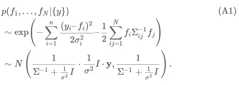 这里,我们简写 f_i≡f(x_i)。请注意,我们已经默认上面正态分布的均值是零。这是为了简便起见:如果非零均值合适,那么可以与均值相加分析,或者从原始 f 中减去非零均值使新的分布均值为零。