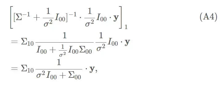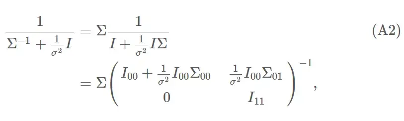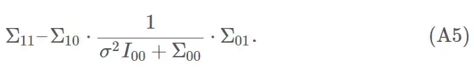 其中第二行的分子分母同时乘了 (1/σ^2) * I_00 的逆。类似地,测试集的协方差由(A3)的右下块给出。得到,