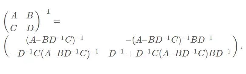 这里我们使用了分块表示法。为了计算上述的逆矩阵,我们将利用分块矩阵求逆公式,