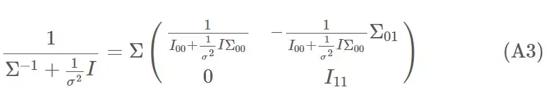 这里,(1/σ^2) * I 在式(6)中被定义,但在样本集外的所有行中都为零。为了得到式(5),我们必须统一为正文中逆矩阵的分块结构。