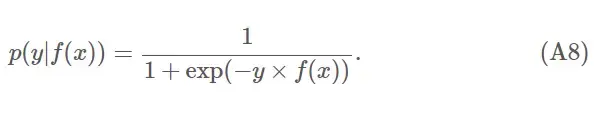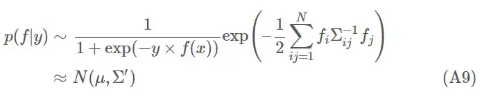 这个公式是 logistic 回归的一个正常非线性泛化。此外,f 的先验概率再次得到等式(3)。使用此式和(A8),我们可以得到 f 的后验概率