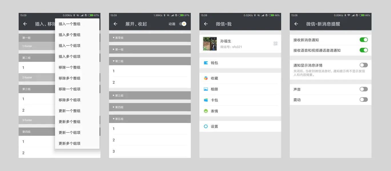 sfsheng0322/GroupRecyclerViewAdapter 孙福生 2018-02-26 283 阅读1分钟 可增删改查、可展开收起的分组列表,轻松帮你实现【微信-我】等类似页面,动态可配置 效果图 Gradle: compile 'com.sunfusheng:GroupRecyclerViewAdapter:<latest-version>' 扫一扫 Fir.im二维码下载APK 个人微信公众号 打点赏给作者加点油^_^ 关于我 GitHub: sfsheng0322 个人邮箱: sfsheng0322@126.com 个人博客: sunfusheng.com 简书主页 新浪微博