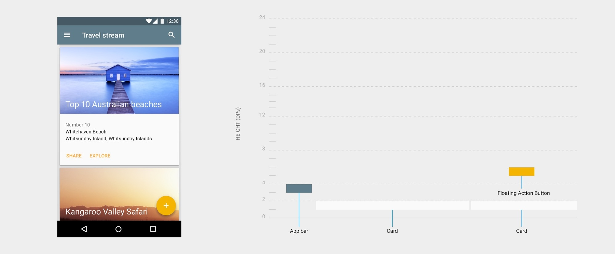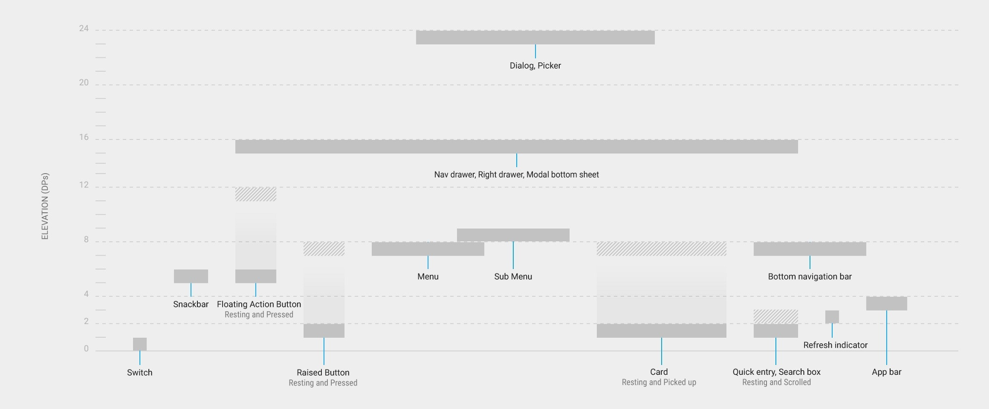 在 Android 中,我们有很多小部件。按钮、CardView、对话框,抽屉等所有这些都是视图。如果有一个光源,我们就有阴影。那么我们如何在Android中决定 Z 值呢?Material Design 是如何规定这些的?