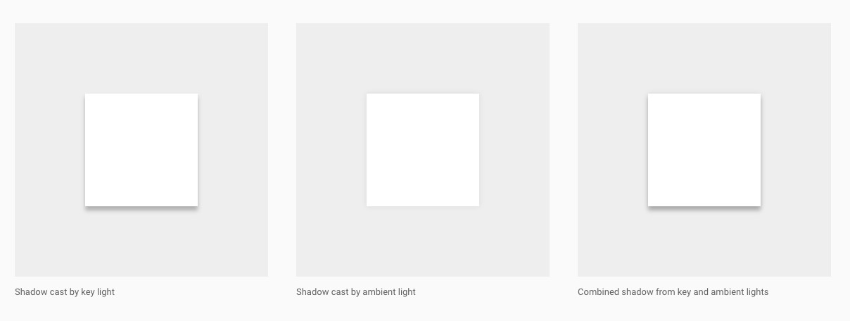 Android 中存在两个光源,顶部那个是关键的光源,而另一个是环境光源,我们看到的阴影实际上是这两个光源的组合。