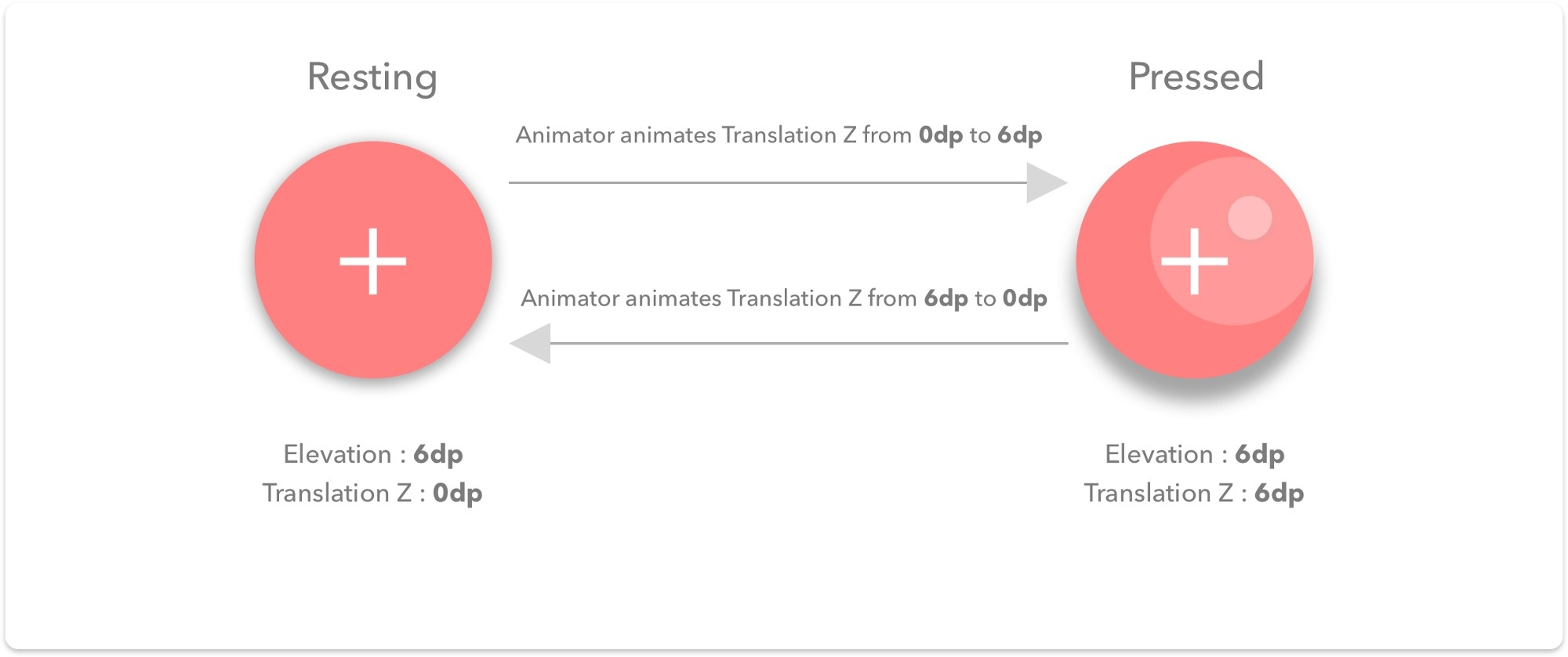 其实FAB有 6dp 的 Elevation。当您按下按钮时,translationZ 值开始增加。ViewPropertyAnimator 通过将 translationZ 值从 0dp 更改为 6dp 来 让视图动起来。如果你释放按钮,ViewPropertyAnimator 播放动画,将 translationZ 从 6dp 变到 0dp。你可以为你的视图创建自定义状态列表动画,并将其添加到你的视图上。