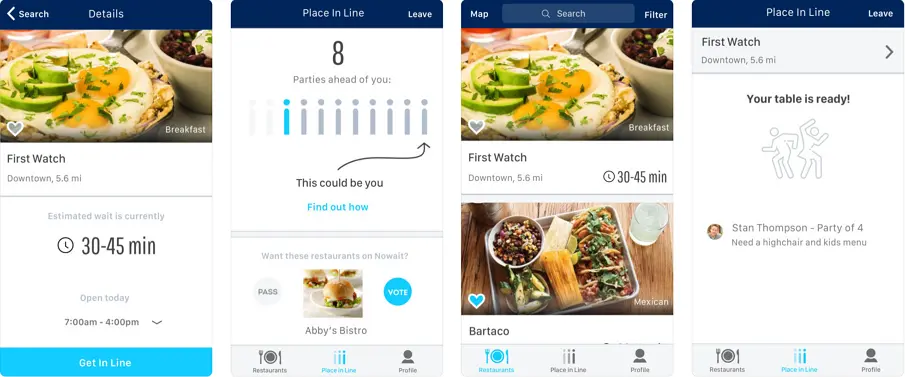Nowait Guest是一个简化生活的iOS App。使用该应用程序,可以为您节约大量的订餐等待时间,很餐厅都已经开始投入使用该App,以方便其顾客可以提早了解其订餐情况,包括Chili's,Buffalo Wild Wings,First Watch等。用户在家时,就可以随时查看附件餐厅的当前等待时间,然后做出决定是否前往。餐厅的图片使用非常吸睛,整个界面看起来让人觉得“垂涎三尺”。